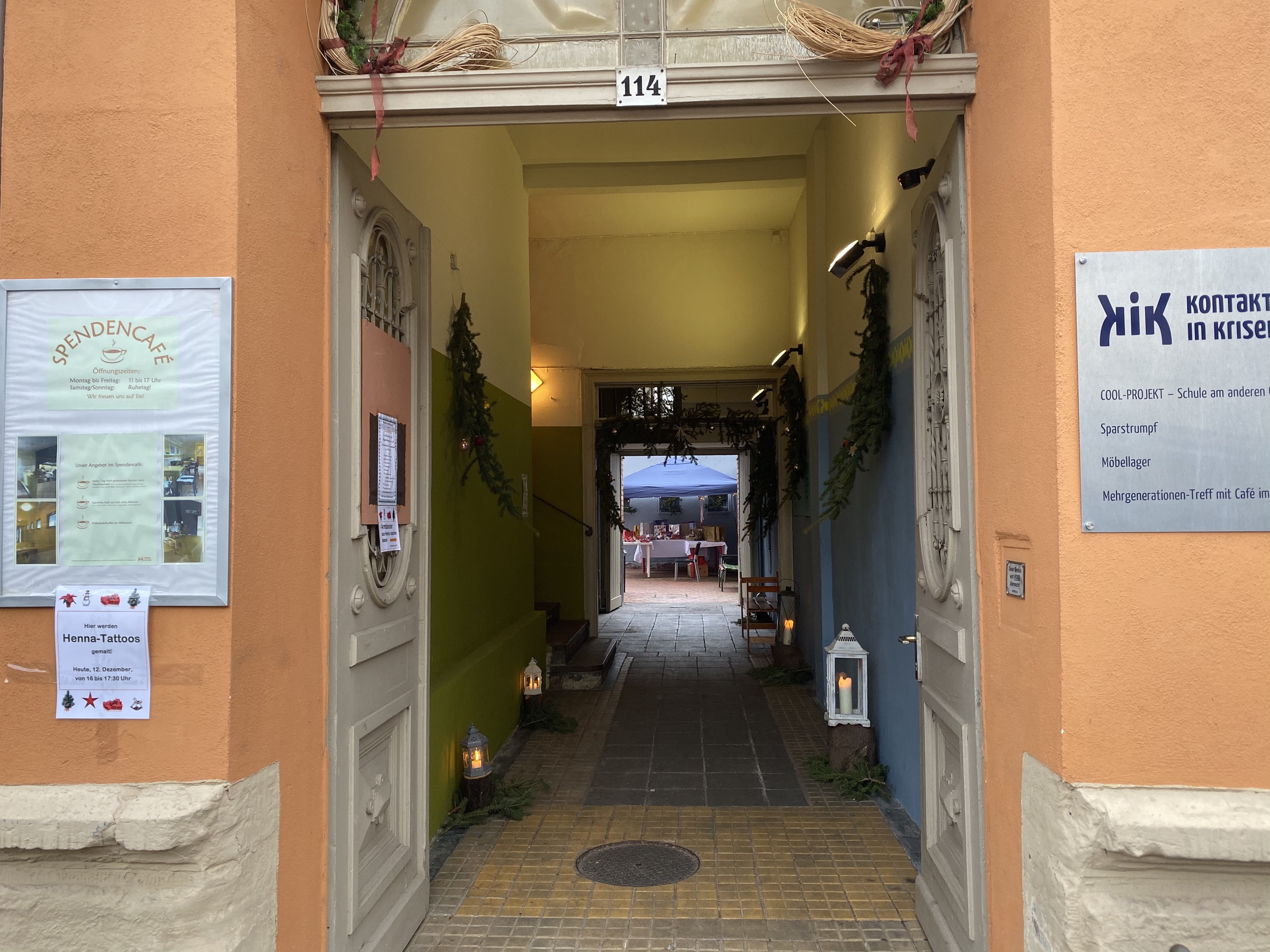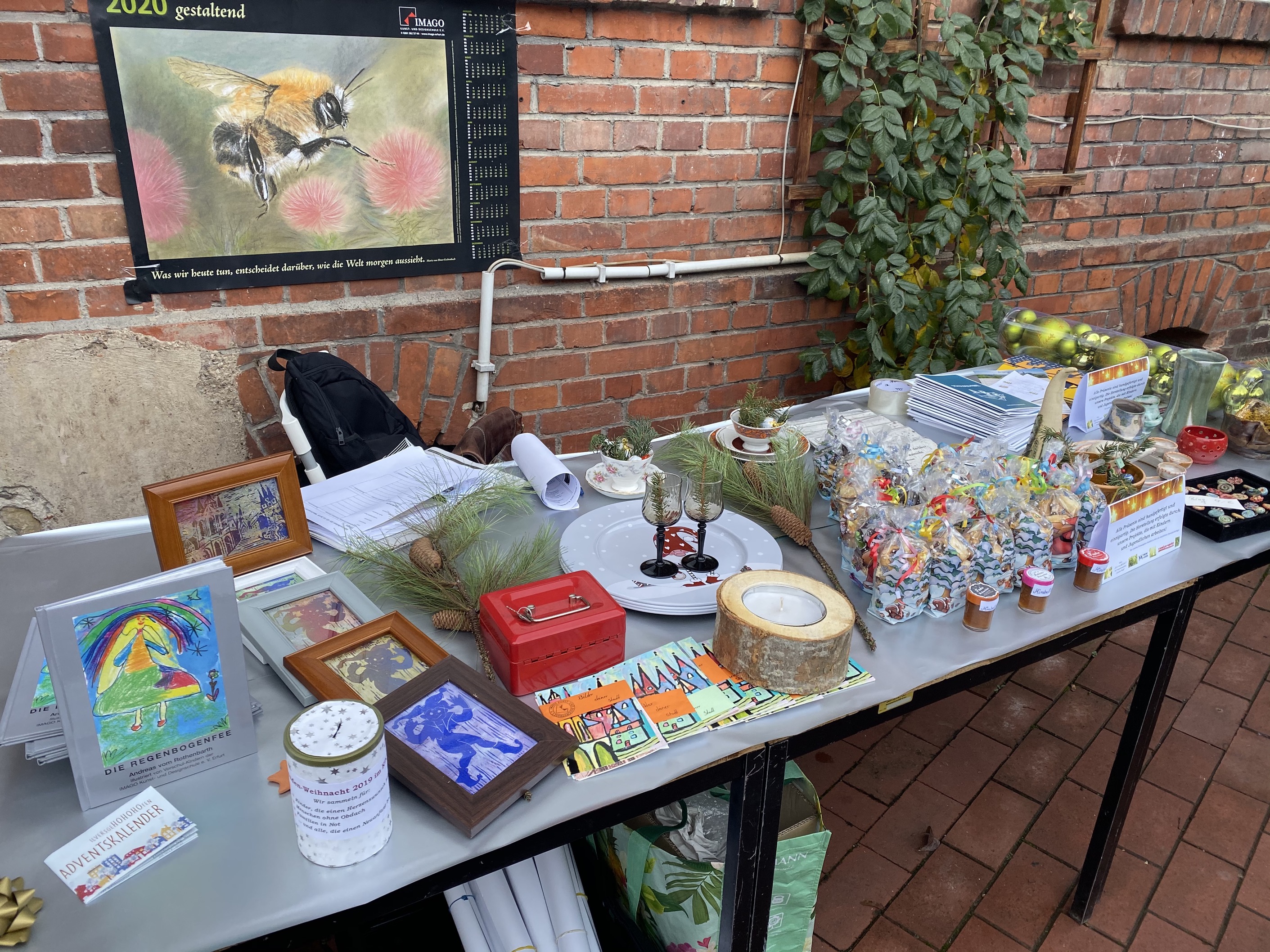 Es gab ein abwechslungsreiches Angebot (Bücher, Plätzchen, Töpferware, Holzdekorationen, Henna-Tattoos sowie handgefertigte Kinderkleidung und eine Tombola) sowie weihnachtliche Musik, die leise im Hintergrund lief. Das Ambiente wurde durch die vielen Beleuchtungen und Kerzen, einen wunderschönen Weihnachtsbaum und die Lagerfeuer abgerundet.